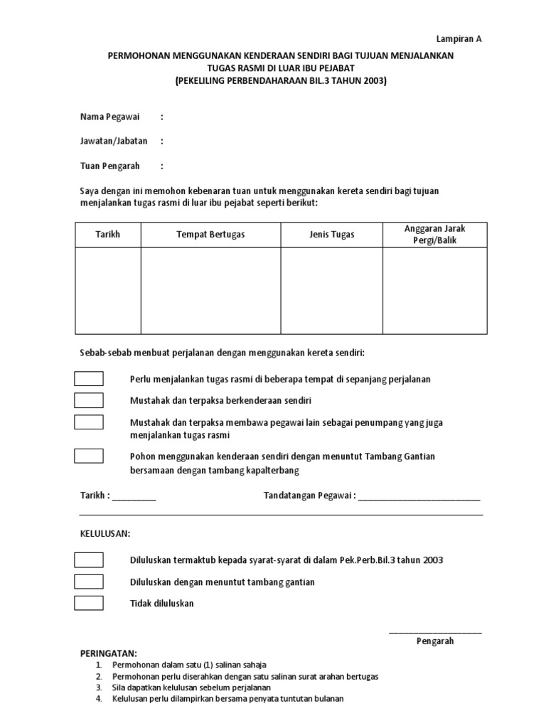 Selain itu, ingin saya nyatakan bahawa segala permasalahan berkenaan kereta tersebut adalah di bawah tanggungjawab saya sendiri. Please copy and paste this embed script to where you want to embed. Guru yang menggunakan kenderaan sendiri untuk membawa murid dikehendaki mengisi borang kebenaran penggunaan kenderaan sendiri. Pastikan roadtax dan insurans hidup (disemak oleh pengetua/gb). Borang ini mengesahkan keadaan dan butiran.